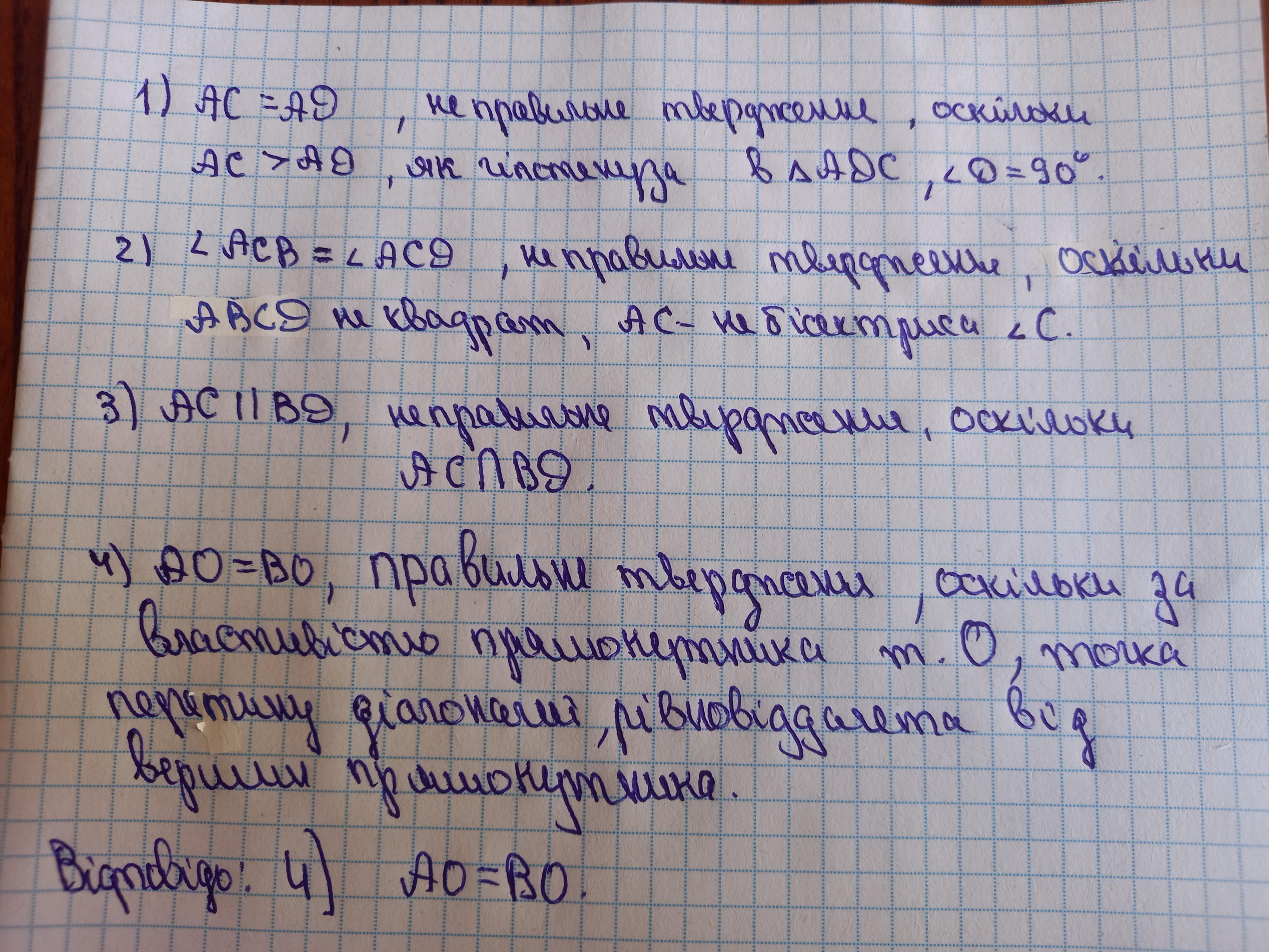 на рисунку зображено прямокутник ABCD відмінний від квадрата укажіть правильне твердження. 1)AC=AD 2)кутACB=кутACD 2)AC паралельне BD 3)AO=BO