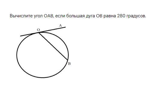 За умовою ОВ - хорда ; ОА - дотична ; U OnB = 280° . Знайти ∠АОВ .