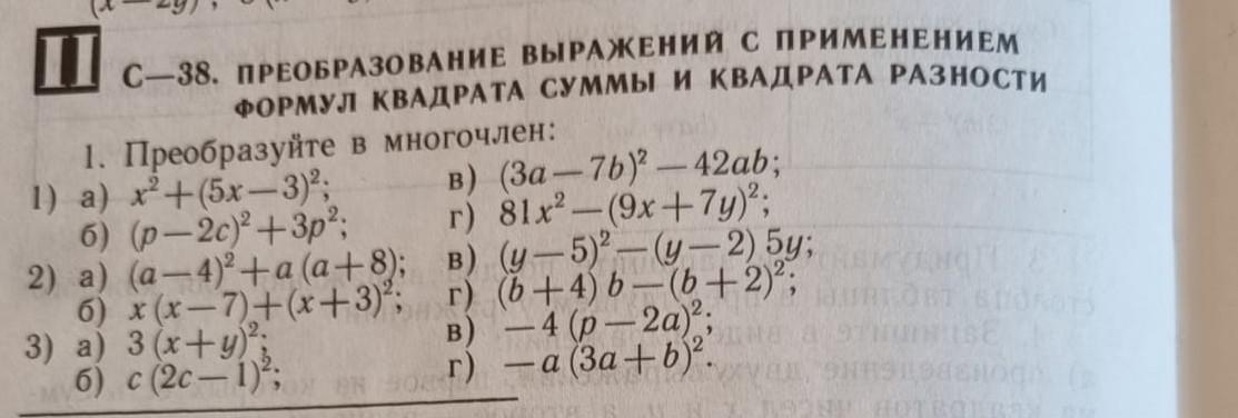 в) (3a-7b)^2-42ab=9a^2-42ab+49b^2-42ab=9a^2-84ab+49b^2;