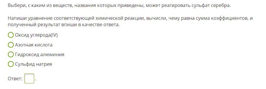 - Ag2SO4 + Na2S≠ Ag2S↓ + Na2SO4 Сумма коэффициентов равна 4