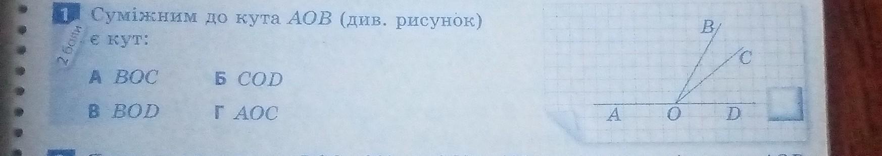 Смежным до угла AOB имеет угол: а) BOC; б) COD; в) BOD; г) AOC