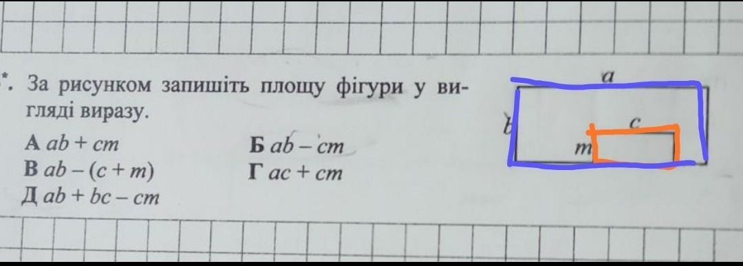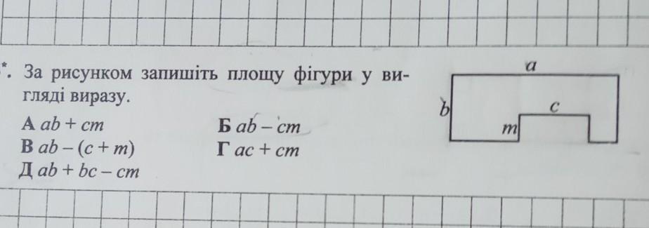 6. За рисунком запишіть площу фігури у ви- гляді виразу. A ab + cm Bab - (c + m) Д ab + bc-cm bab-cm Г ас + см Ы m a C