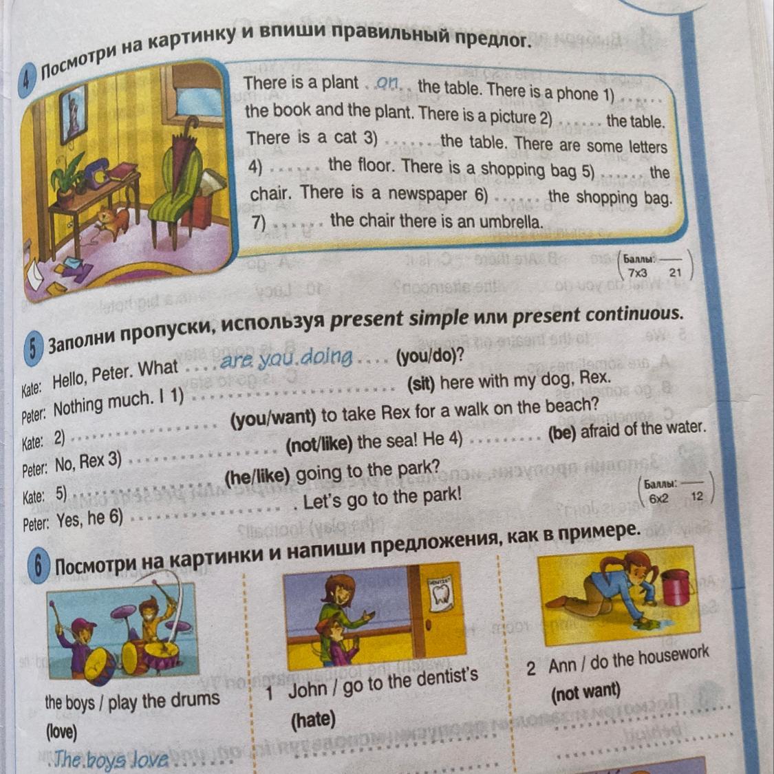 На столе есть растение. Есть телефон 1) между книгой и растением.2) Над столом есть картинка. Кот - 3) под столом. 4) На полу лежат письма. 5) Позади стула есть сумка для покупок.6) В хозяйственной сумке есть газета 7) На стуле есть зонт.