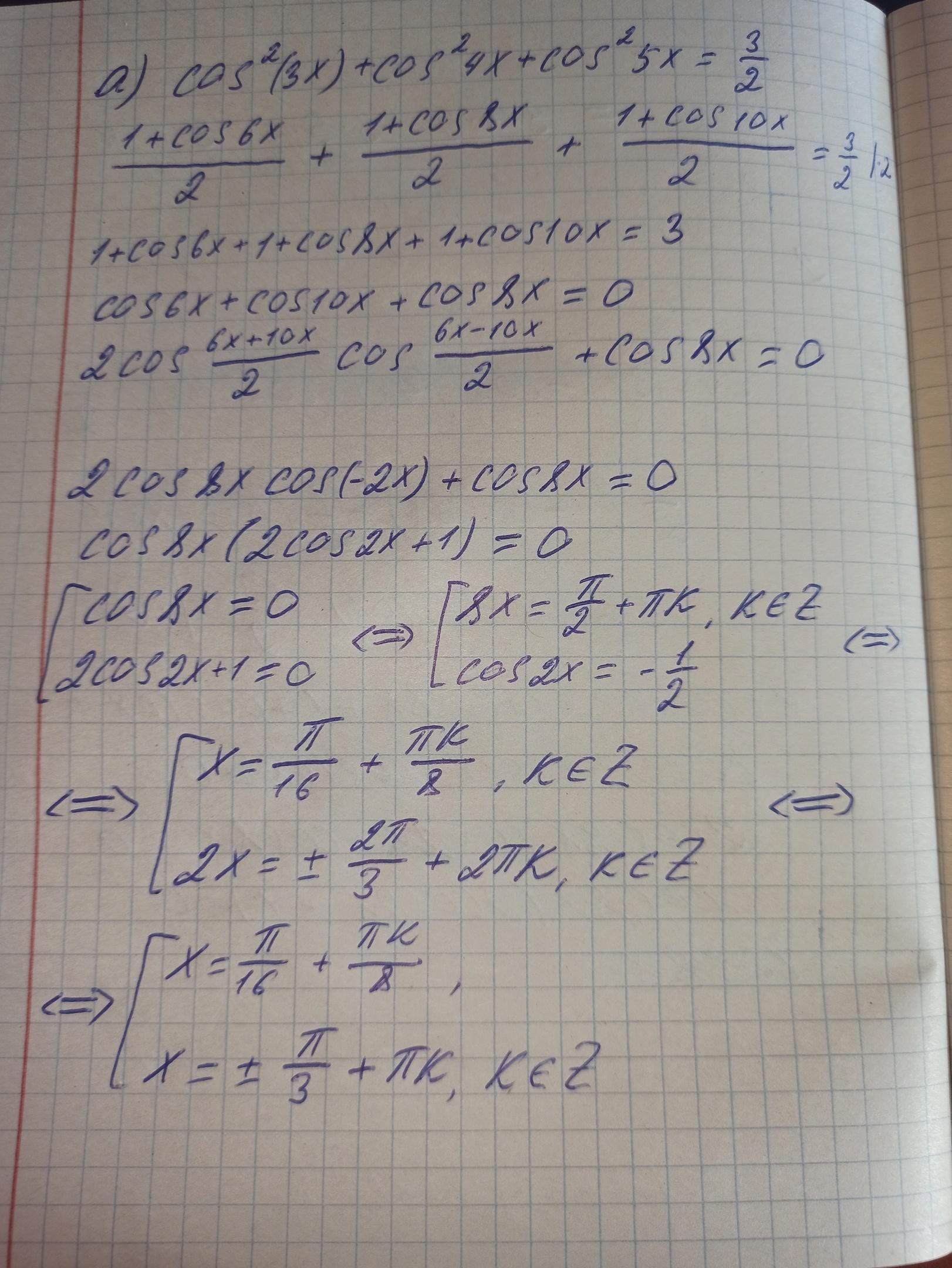 А) Решите уравнение 〖cos〗^2 3x+〖cos〗^2 4x+ 〖cos〗^2 5x=3/2