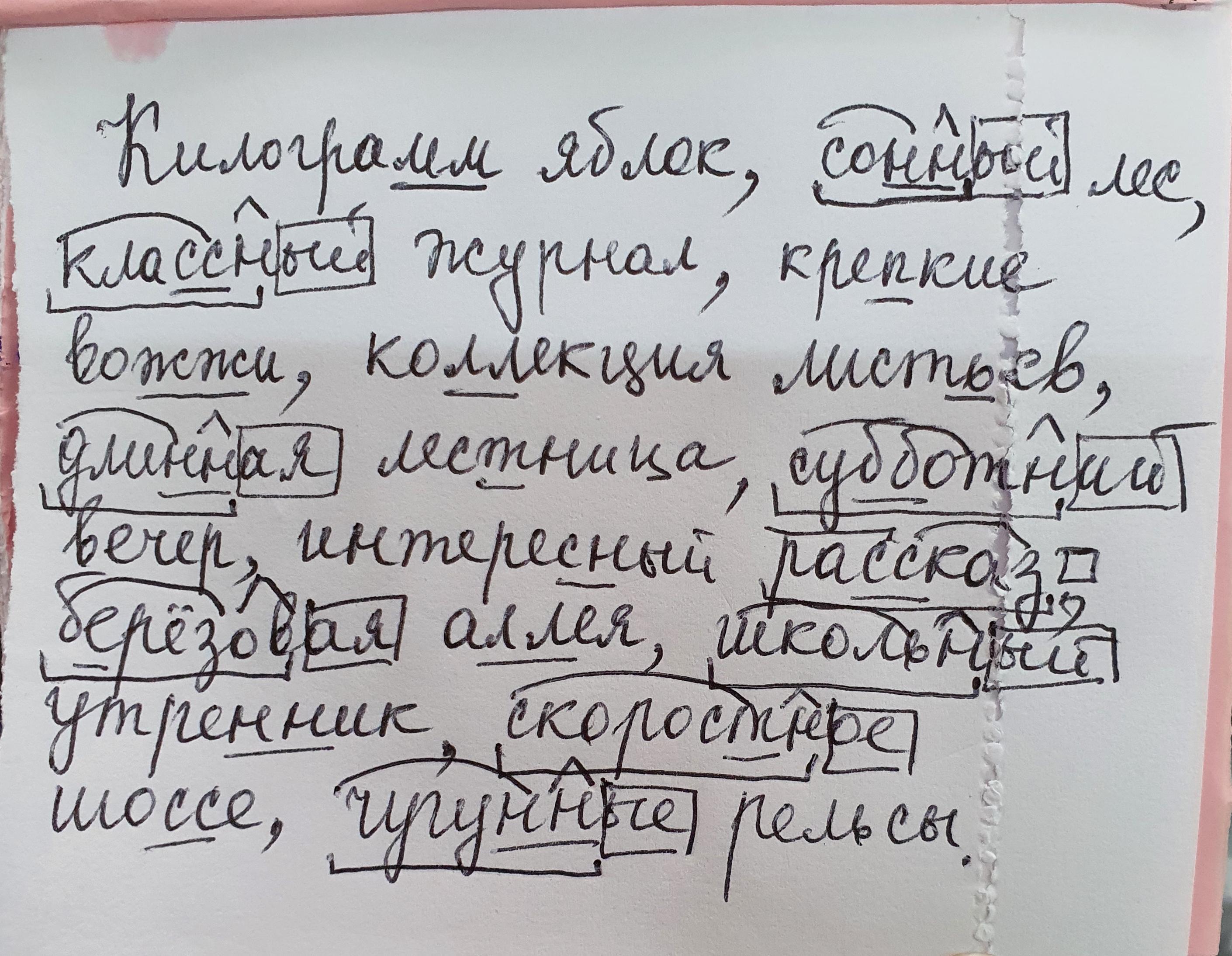 Килограмм яблок, сонный2 лес, классный2 журнал, кре..кие вожжи, коллекция лист..ев, длинная2 лес..ница, субботний2 вечер, интерес..ный рассказ2, б..рёзовая2 аллея, школьный2 утренник, скорос..ное2 шоссе, чугунные2 рельсы.
