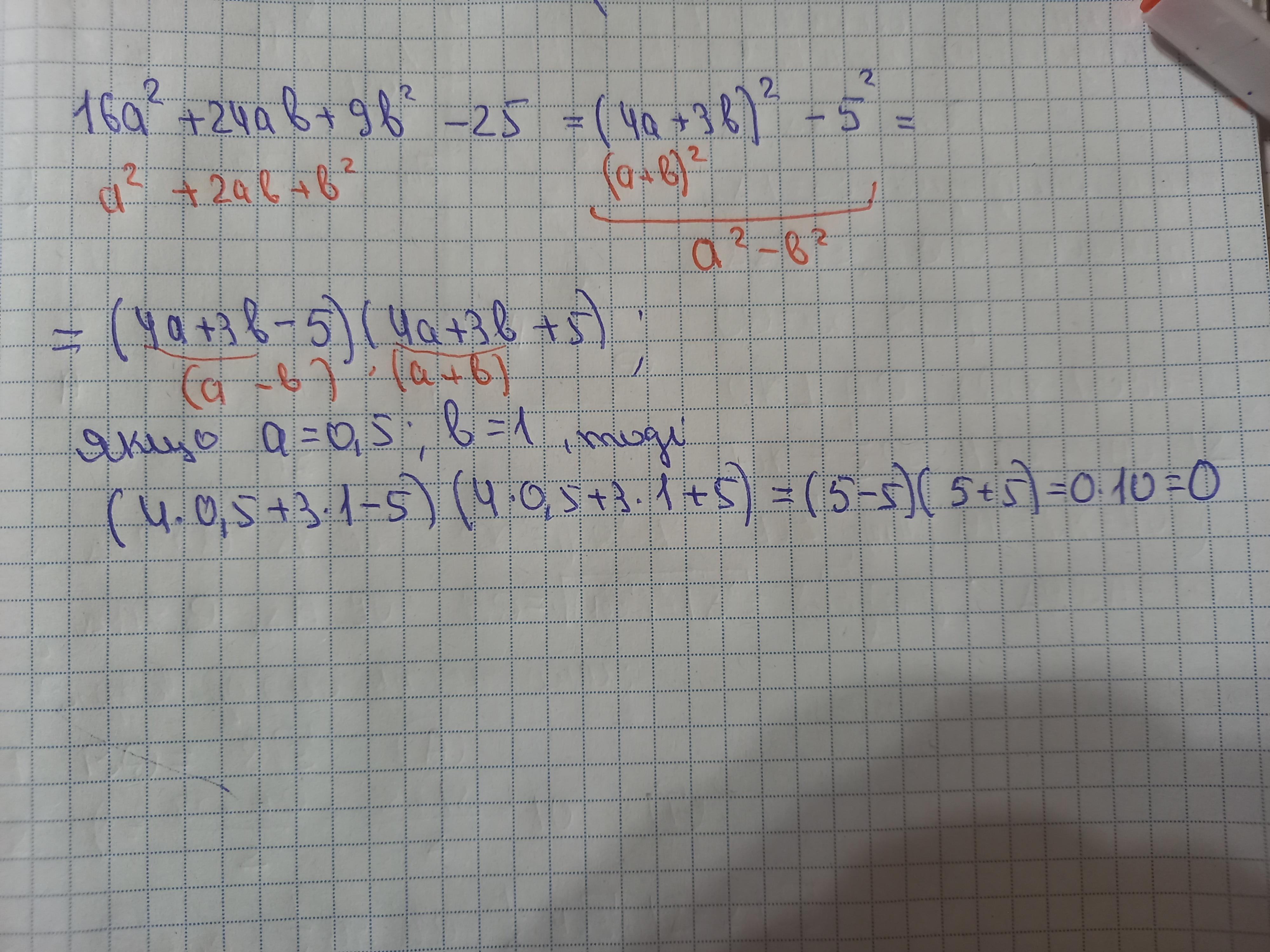 Записати вираз 16а²+24ab+9b²-25 у вигляді добутку і знайти його значення, якщо а=0,5, b=1.