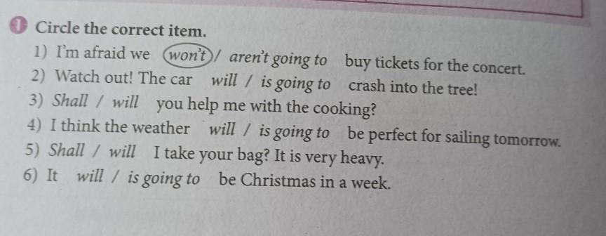 1) I'm afraid we 2) Watch out! The car will / is going to 3) Shall / will you help me with the cooking? 4) I think the weather will/ is going to be perfect for sailing tomorrow. 5) Shall / will I take your bag? It is very heavy. 6) It will / is going to be Christmas in a week. won't won't/ aren't going to buy tickets for the concert. crash into the tree!