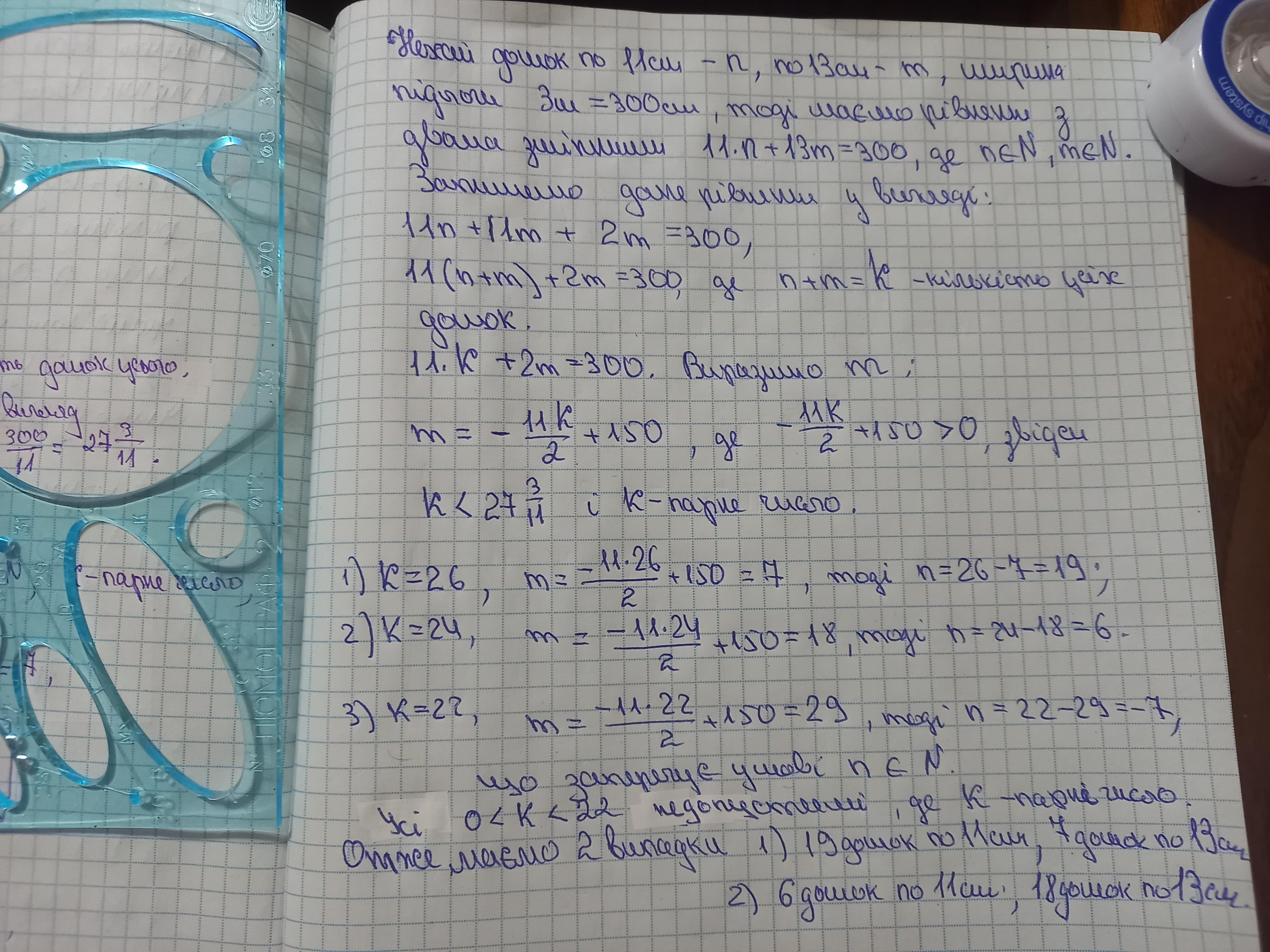 Значит можно уложить 19 дощечек по 11 см и 7 дощечек по 13 см либо 6 дощечек по 11 см и 18 дощечек по 13 см.