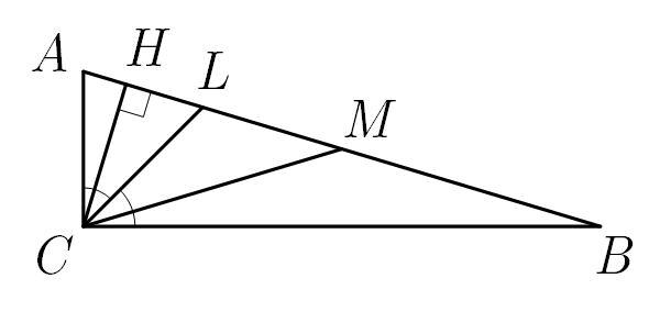 висотою і медіаною, проведеними до гіпотенузи, пополам
