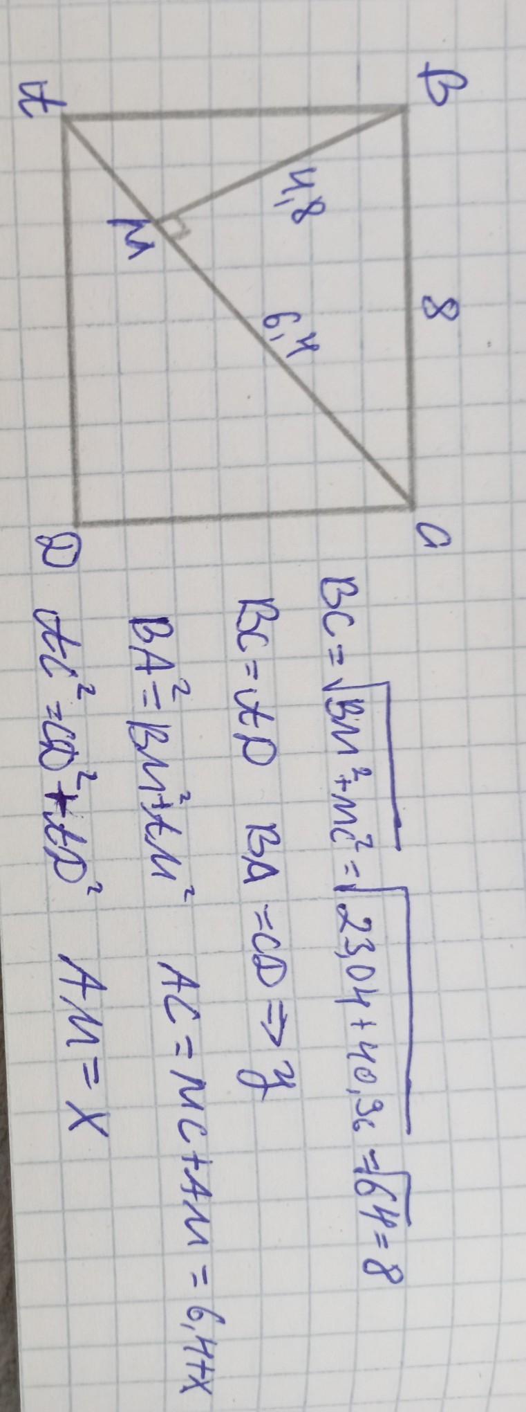ABCD - прямоугольник , ВМ ⊥ АС , ∪ВМ=4б8 , МС=6,4