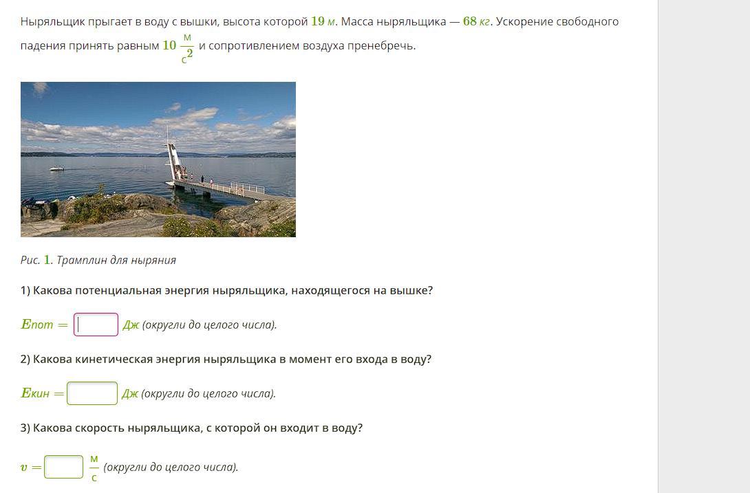 Ныряльщик прыгает в воду с вышки, высота которой 19 м. Масса ныряльщика — 68 кг. Ускорение свободного падения принять равным 10 мс2 и сопротивлением воздуха пренебречь.
