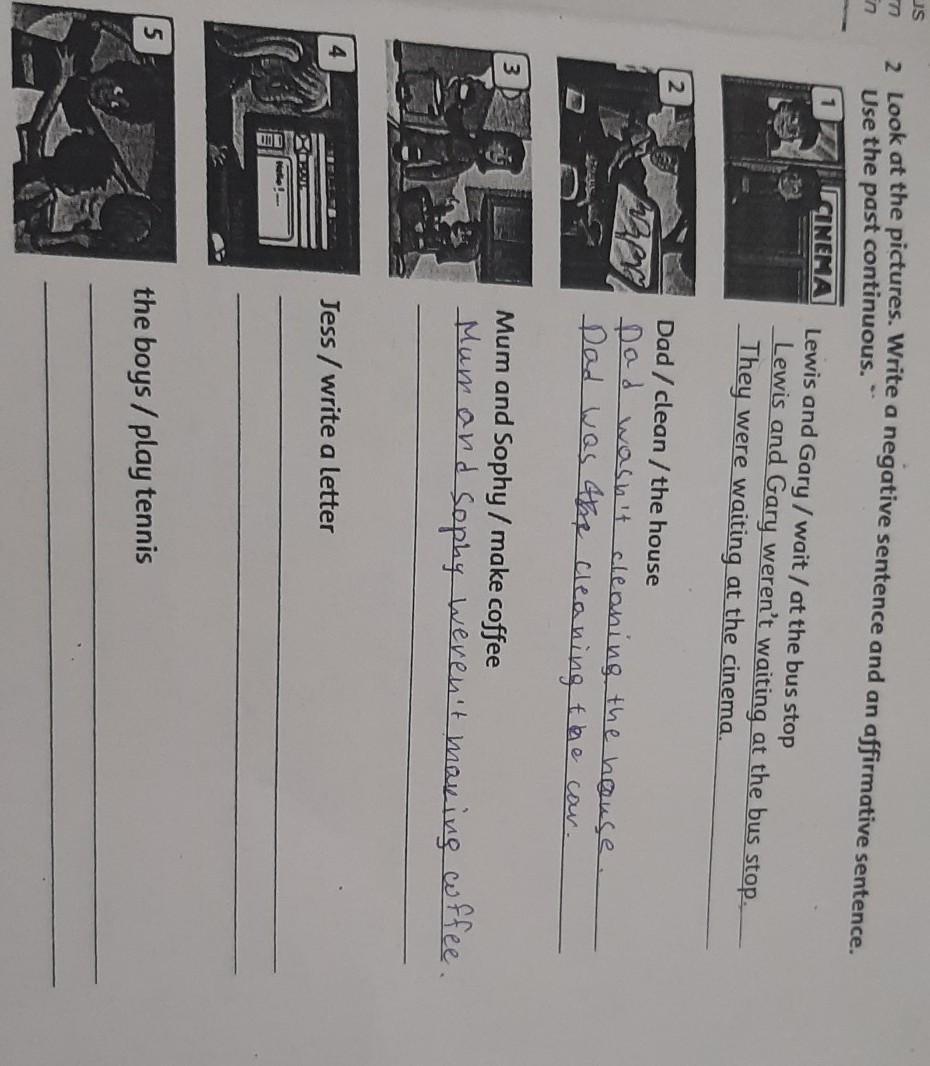 3) Look at exercise 2. Write questions and short answers. 1 Lewis and Gary/wait / at the bus stop Were Lewis and Gary waiting at the bus stop? No, they weren't. 2 Dad/clean/the car 3 Mum and Sophy/make/ dinner 4 Jess/write/ a letter 5 the boys /play/basketball