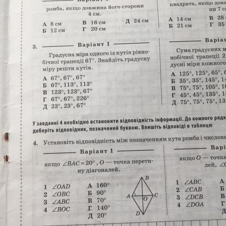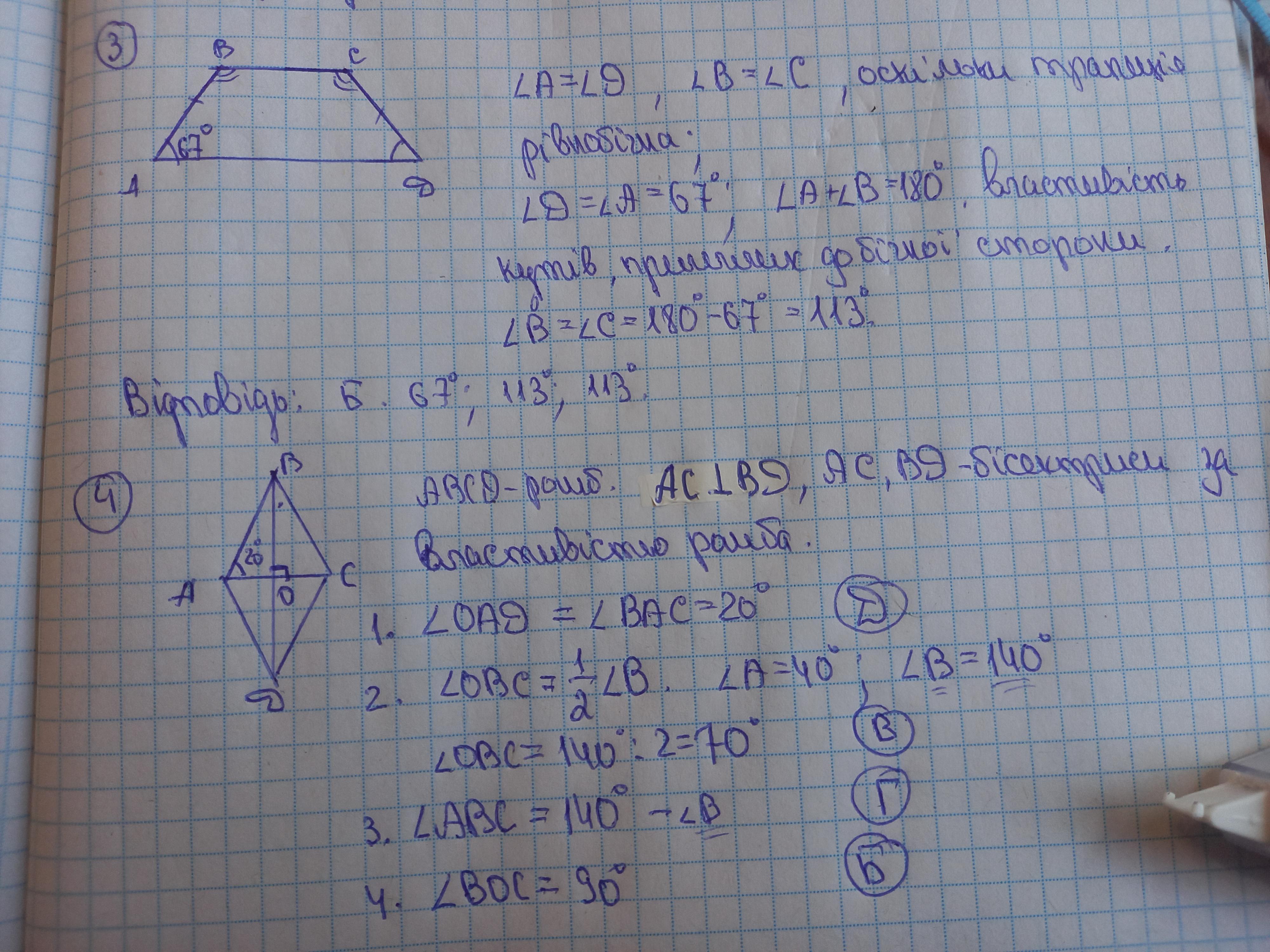 3. трапеция равнобедренная, следовательно углы при одинаковых основаниях у неё равны. Значит, острые углы равны по 67 градусов. Углы при боковых основаниях трапеции в сумме дают 180 градусов. Значит, один тупой угол равен 180-67=113 градусов. Другой тупой угол будет тоже равен 113 градусам