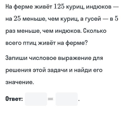 125+100+20=245 птиц живёт на ферме