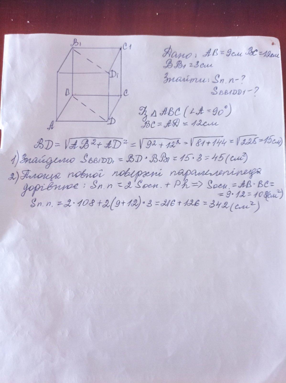 Сторони основи прямокутного паралелепіпеда дорівнюють 12 см і 9 см, а висота – 3 см.