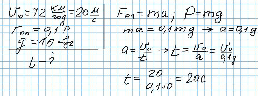 V0 = 72 км/год. При гальмуванні розвивається сила опору руху, рівна 0,1 ваги автомобіля. Знайти час гальмування