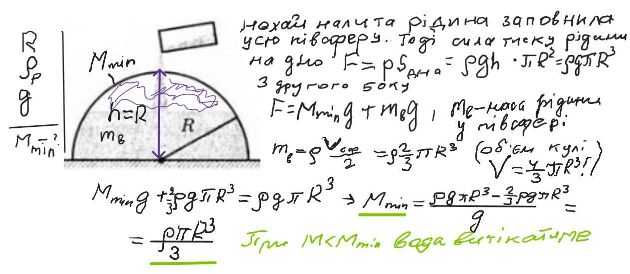 На столі стоїть посудина, що має форму півсфери радіусом R. Край посудини щільно прилягає до стола. У верхній точці посудини є маленький отвір, через який наливають рідину з густиною ρ. За якою маси посудини з-під неї може витікати рідина?