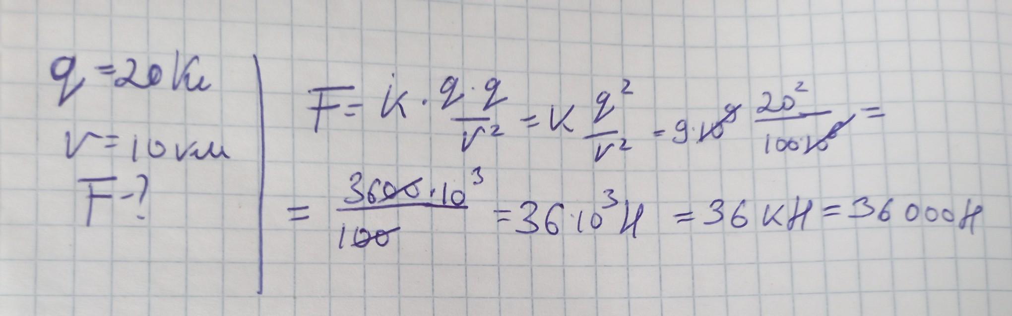 Визначити силу взаємодії двох хмарин, які мають різнойменні заряди по 20 Кл кожна, якщо відстань між ними 10 км
