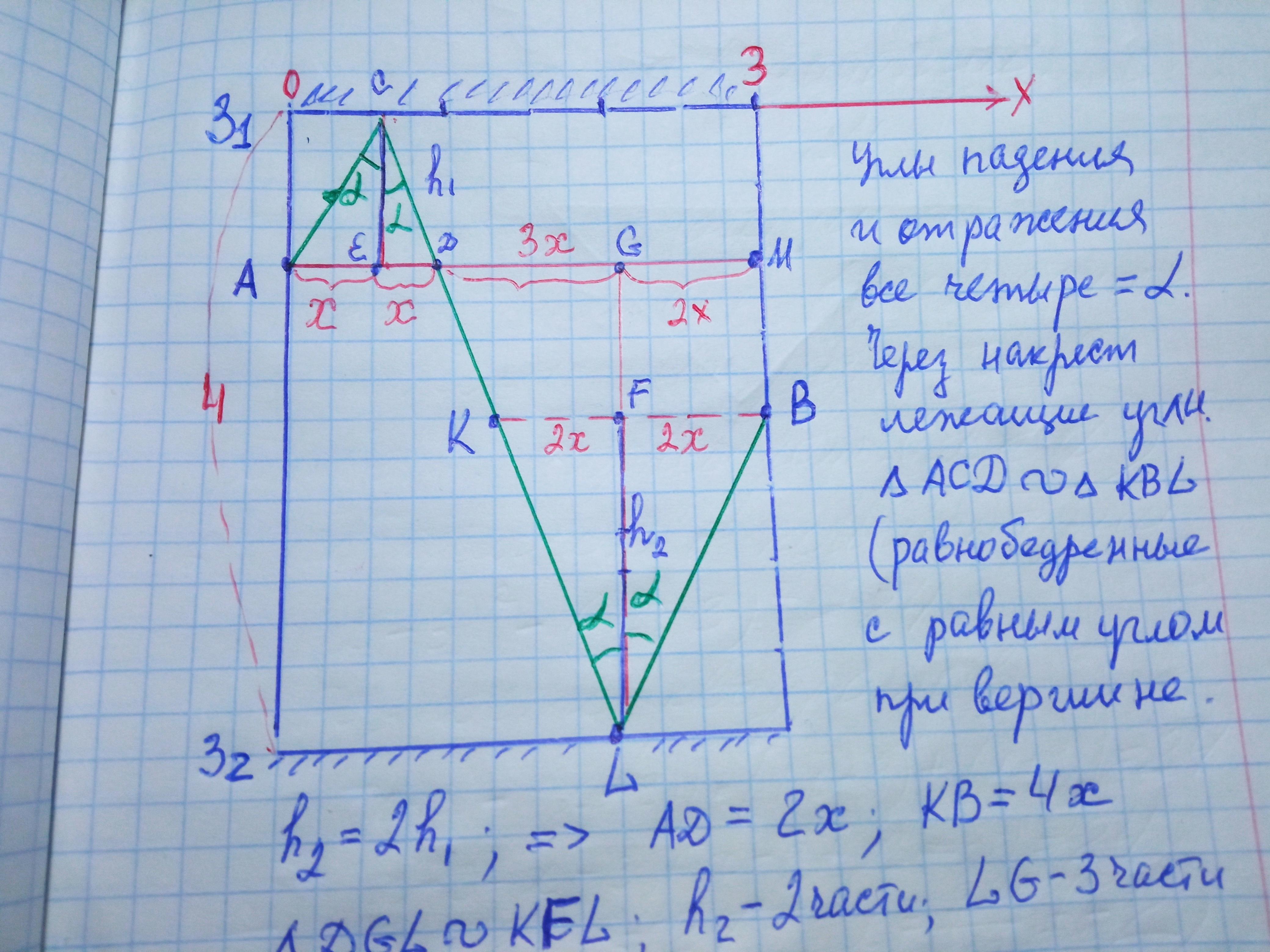 Углы падения и отражения одинаковые. А координаты? Геометрия...