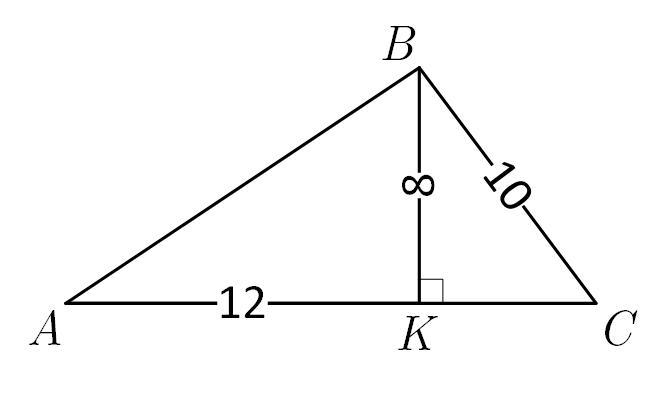В трикутнику АВС сторона ВС дорівнює 10см, а висота ВК дорівнює 8см. Ця висота відтинає відрізок АК довжиною 12см. Знайти сторони АС і АВ.