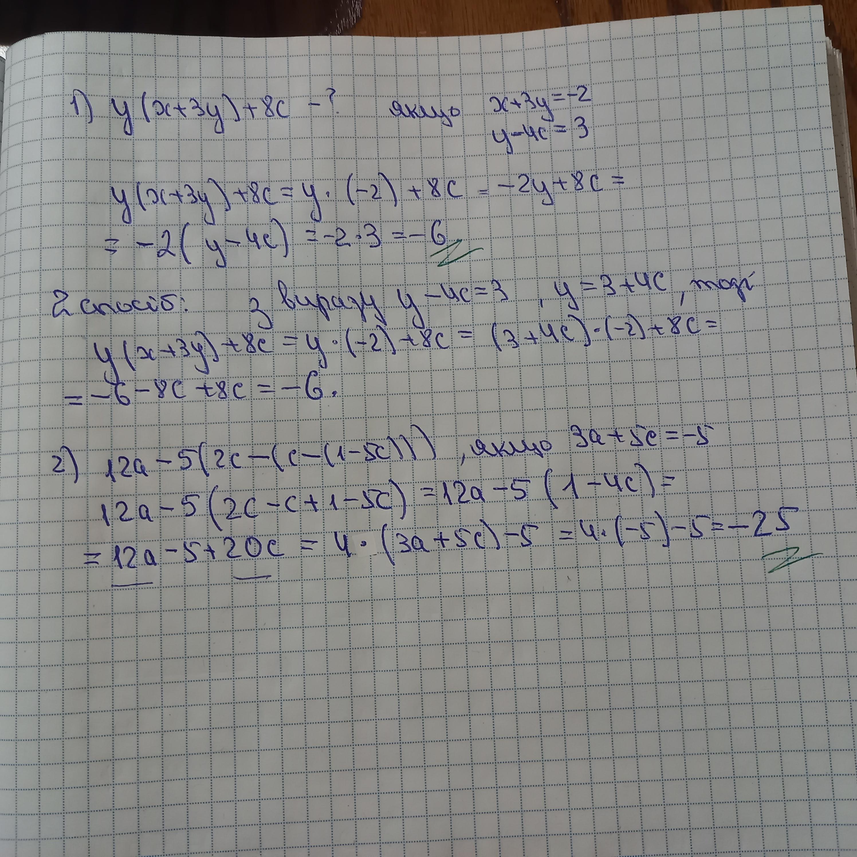 1) Знайди значення виразу у( х+3у ) + 8с, якщо х+3у = -2 та у - 4с =3
