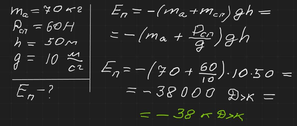Еп=mgh=(mh+Р)*h=(70*10+60)*(-50)=-38000Дж=-38кДж