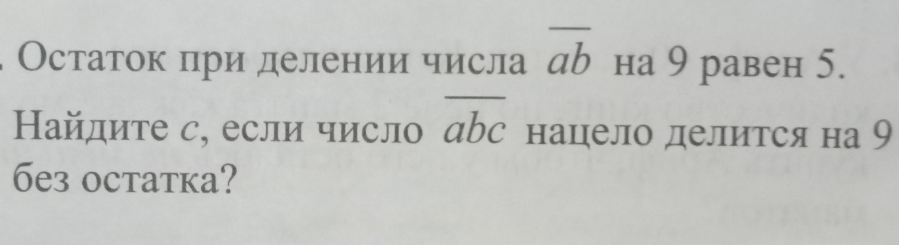 Остаток при делении числа ab на 9 равен 5.найдите c,если число abc нацело делится на 9 без остатка(Срочно сегодня нужен ответ)