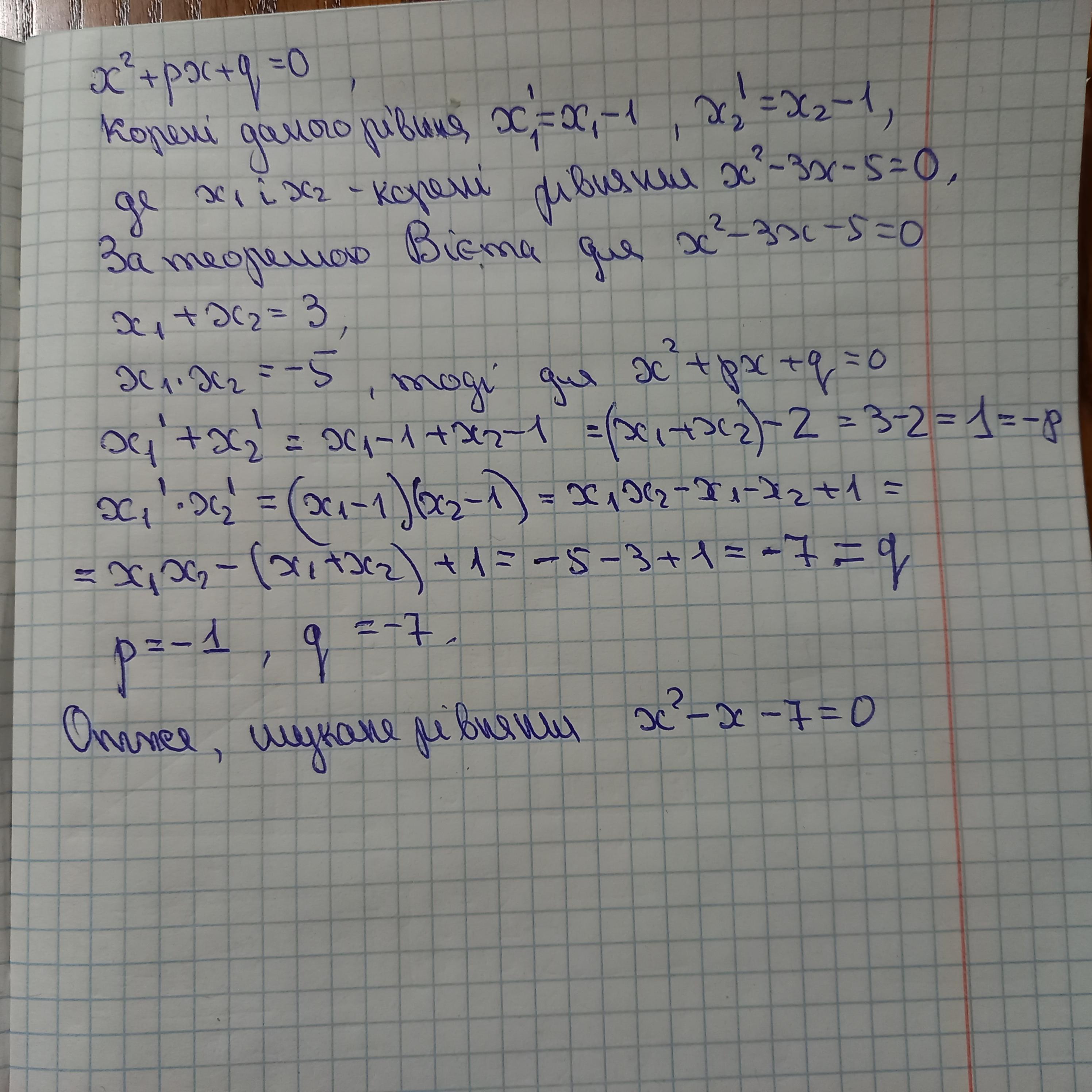 Складіть квадратне рівняння, корені якого менші від відпо відних коренів рівняння x ^ 2 - 3x - 5 = 0 на 1