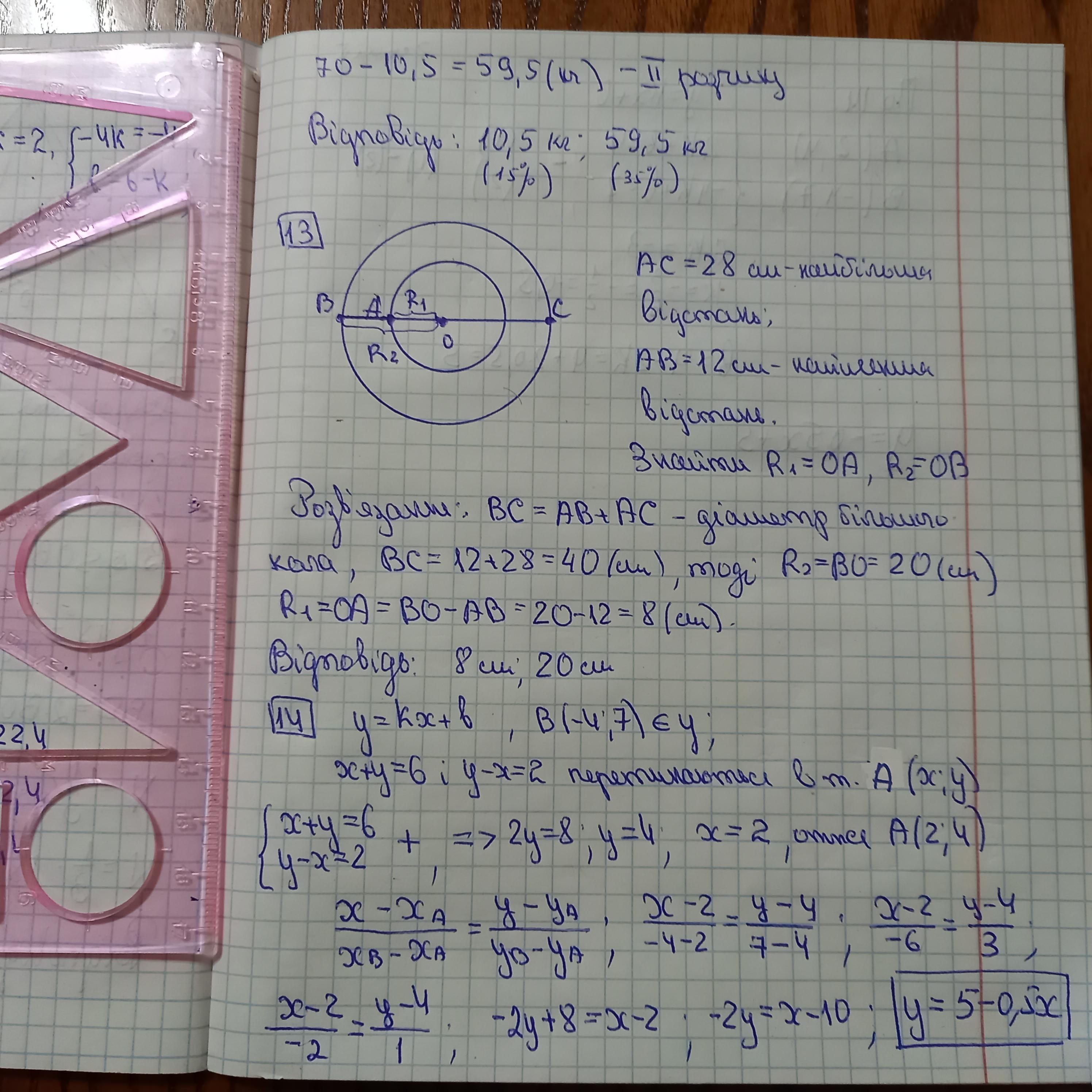 13. Найбільша відстань між точками двох концентричних кіл дорівнює 28 см, найменша 12 см. Знайди радіуси цих кіл.