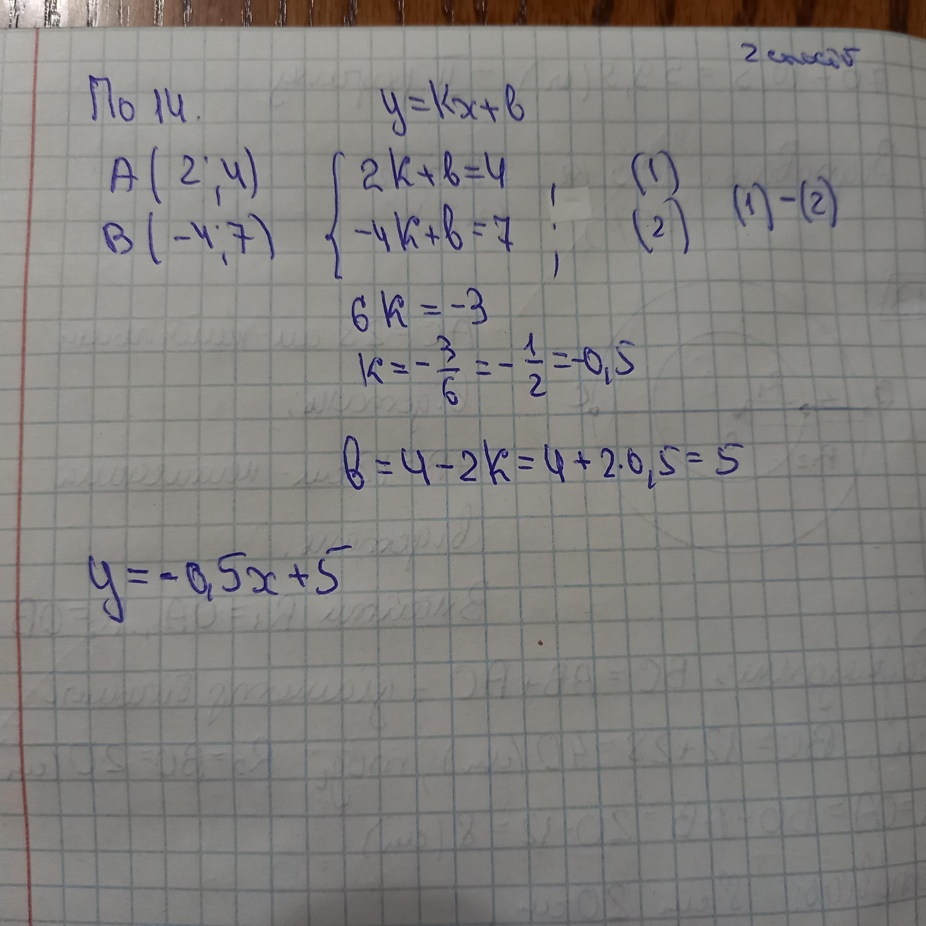 14. Пряма у= кх+ b проходить через точку B(-4; 7) i точку перетину графіків рівнянь x+y=6 i у-х= 2. Запиши рiвняння цієї прямої.