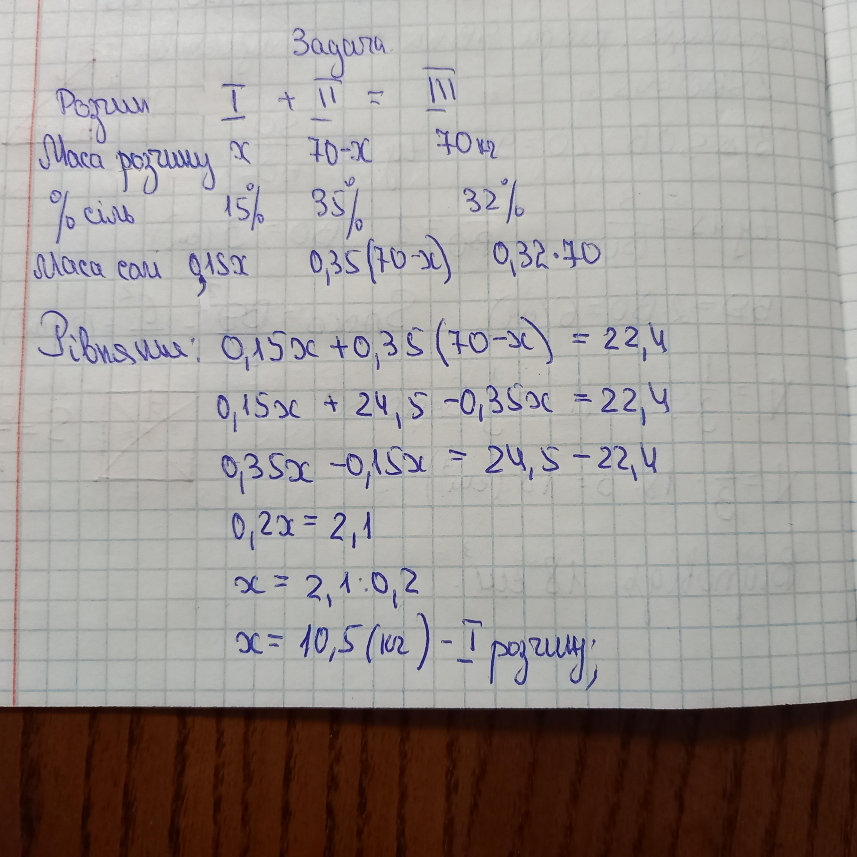 Моемо два водно-сольових розчини. Перший містить 15%, а другий 35% coni. Скільки кілограмів кожного розчину потрібно взяти, щоб отримати розчин масою 70 кг, що містить 32% солі?