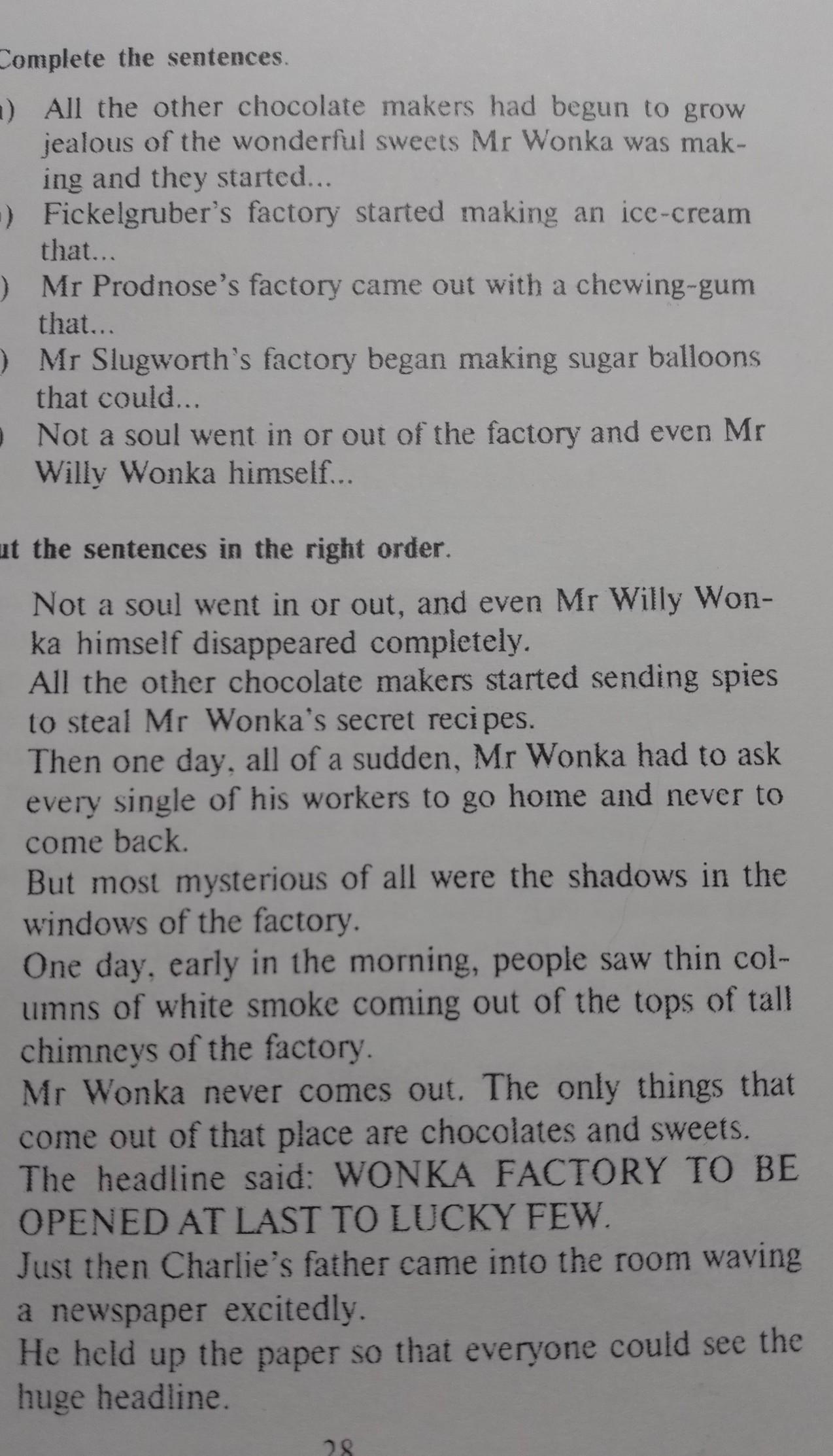 Доповніть речення. ) Усі інші виробники шоколаду почали заздрити чудовим цукеркам, які виготовляв містер Вонка, і вони почали ... ) Фабрика Фікельгрубера почала виготовляти морозиво, яке ... ) Фабрика містера Продноса випустила жувальну гумку що ... ) Фабрика містера Слагворта почала виготовляти цукрові повітряні кульки, які могли ... Жодна душа не входила і не виходила з фабрики, і навіть сам містер Віллі Вонка .... викладав речення в правильному порядку . Жодна душа не увійшла й не вийшла, і навіть сам містер Віллі Вон Ка повністю зник. Усі інші виробники шоколаду почали надсилати шпигунів, щоб викрасти секретні рецепти містера Вонки. І раптом одного разу містеру Вонці довелося попросити всіх своїх працівників піти додому й ніколи не повертатися. Але найзагадковішими були тіні у вікнах фабрики. Одного разу рано вранці люди побачили тонкі стовпчики білого диму, що виривався з верхівок високих труб фабрики. Містер Вонка ніколи не виходить. Єдине, що виходить з цього місця, це шоколад і цукерки. У заголовку було сказано: ФАБРИКА WONKA НАРЕШТІ БУДЕ ВІДКРИТА ДЛЯ НЕБАГАТЬОХ ЩАСЛИВЧІВ. Саме тоді батько Чарлі увійшов до кімнати, схвильовано розмахуючи газетою. Він підняв газету так, щоб усі побачили величезний заголовок. 3АКПиTи