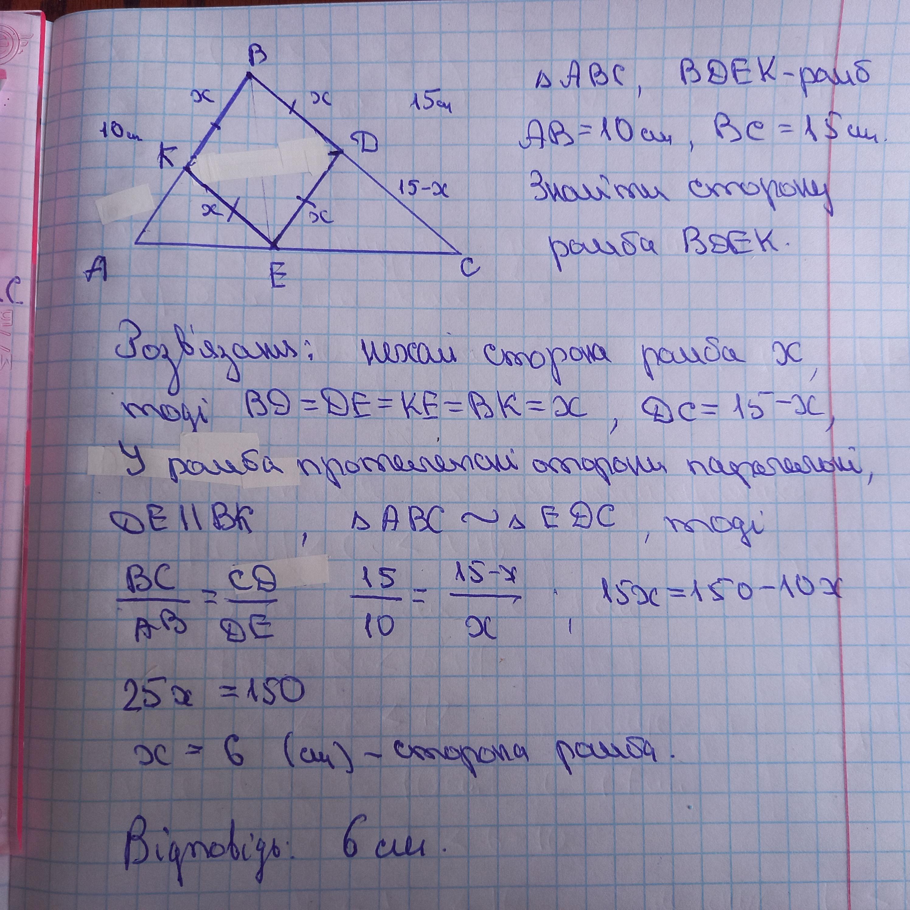 На рисунку зображено трикутник ABC і вписаний у нього ромб BDEK. Знайдіть сторону ромба, якщо AB = 10 см, BC = 15 см