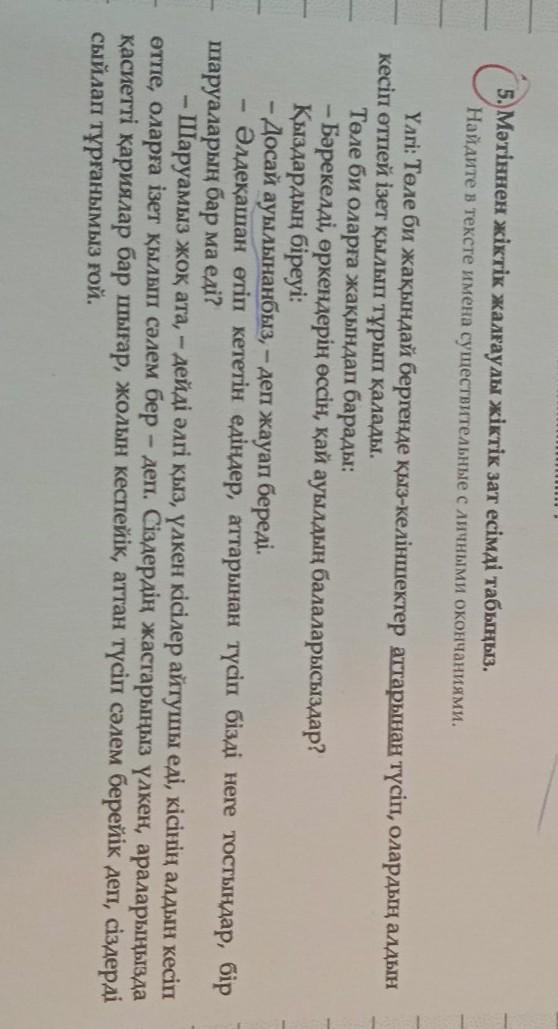 5. Məri 5. Мәтіннен жіктік жалғаулы жiктiк зат есімді табыңыз. Найдите в тексте имена существительные с личными окончаниями. Үлгі: Төле би жакындай бергенде кыз-келіншектер аттарынан түсіп, олардың алдын кесіп өтпей iзет кылып тұрып қалады. Төле би оларга жакындап барады: - Бәрекелді, өркендерің өссін, қай ауылдын балаларысыздар? Қыздардың біреуі: - Досай ауылынанбыз, - деп жауап береді. Әлдеқашан өтіп кететін едіндер, аттарынан түсіп бiздi неге тостындар, бір шаруаларын бар ма еді? - Шаруамыз жок ата, - дейді әлгі қыз, үлкен кісілер айтушы еді, кісінің алдын кесіп өтпе, оларға ізет кылып сәлем бер - деп. Сiздердің жастарыныз үлкен, араларыңызда қасиеттi қариялар бар шыгар, жолын кеспейiк, аттан түсіп сәлем берейік деп, сіздерді сыйлап тұрғанымыз гой.