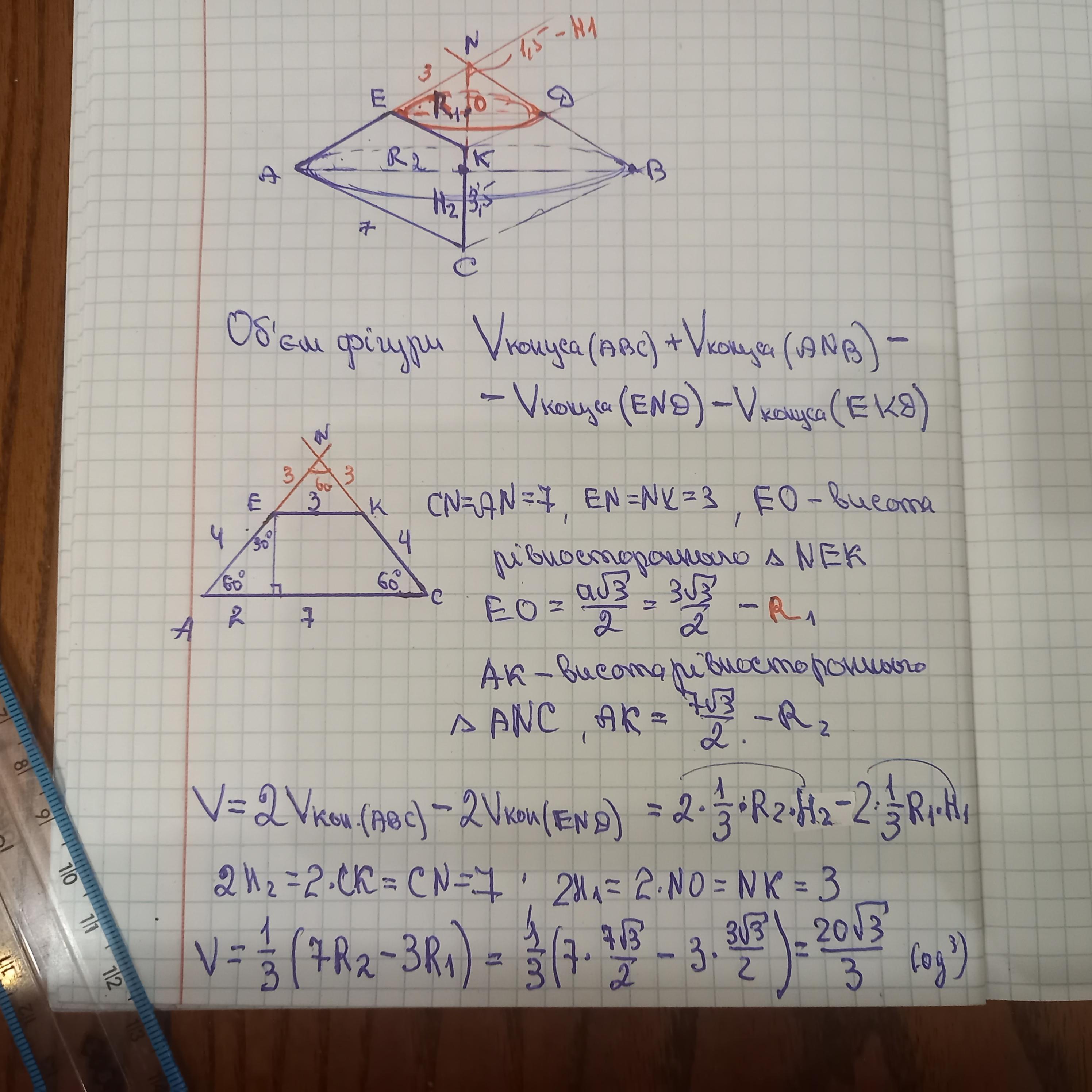 Об'єм даної фігури це різниця об'єма фігури , утвореної обертанням рівностороннього трикутника навколо сторони довжиною 7, та об'єма фігури , утвореної обертанням рівностороннього трикутника навколо сторони довжиною 3.