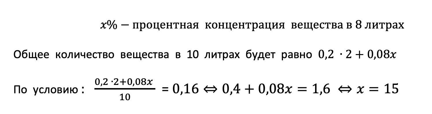 В ёмкость налили 2 литра 20-проц-го водного раствора некоторого вещества.Затем туда добавили еще 8 литрового водного раствора того же вещества.В результате получился раствор с 16-процен-ой концетрацией .Какова была концетрация раствора объёмом 8 литров.Ответ дайте в %
