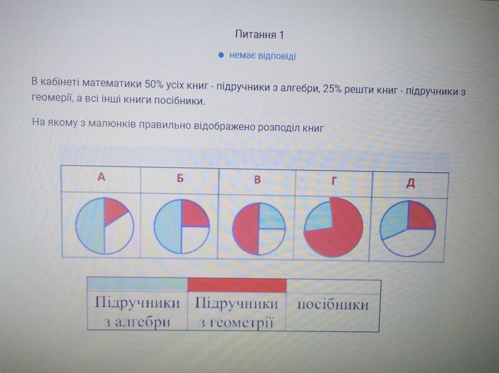 Так як підручників з алгебри 50%, тобто половина кола повинна бути зафарбована у блакитний колір, підручників з геометрії 25%, тобто повинна бути зафарбована меше чверті у червоний колір.