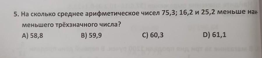 Теперь найдем на сколько среднее арифметическое чисел 75,3; 16,2 и 25,2 меньше наименьшего трехзначного числа: