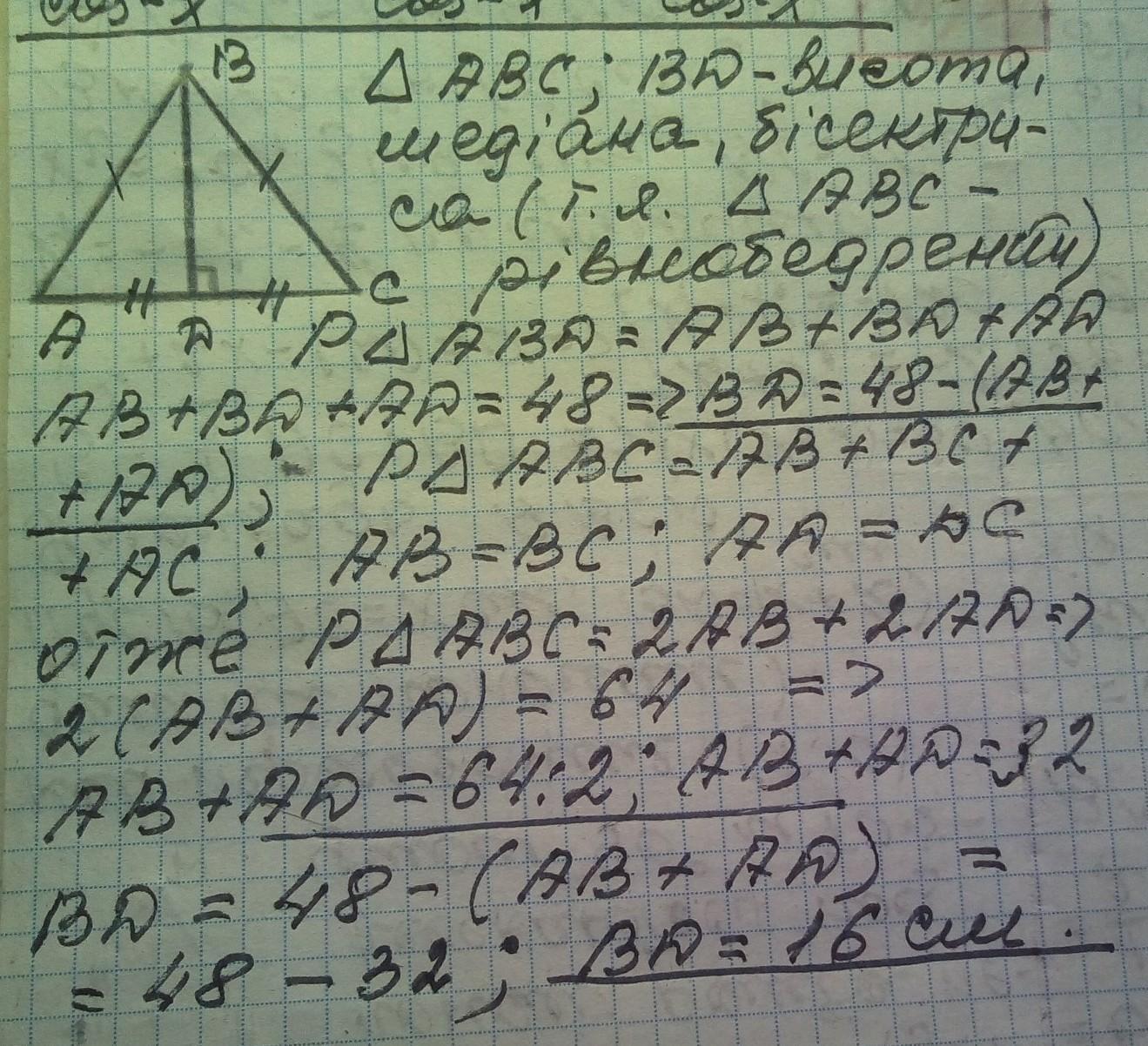 В равнобедренном треугольнике ABC проведена высота BD до основания AC. Периметр треугольника АВС = 64 см, а периметр треугольника ABD = 48 см. Рассчитай длину медианы BD.
