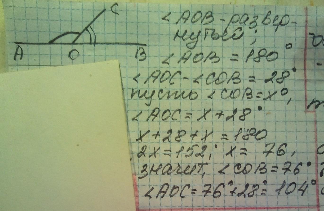 Развернутый угол разделен на две части, разность которых равна 28. Найти образовавшиеся углы