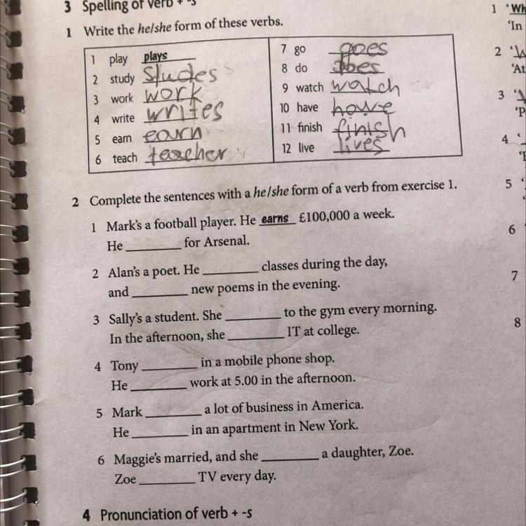 1. Когда действие исполняют подлежащие он, она оно(He, She, It), к глаголу - сказуемому+ окончание -s,- es. Поэтому, в упр.1: plays, studies, works, writes, earns, teaches, goes, does, watches, has, finishes, lives.