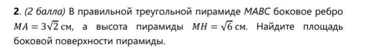 В правильной треугольной пирамиде MABC боковое ребро MA = 3√2 см, а высота пирамиды МН = √6 см. Найдите площадь боковой поверхности пирамиды.