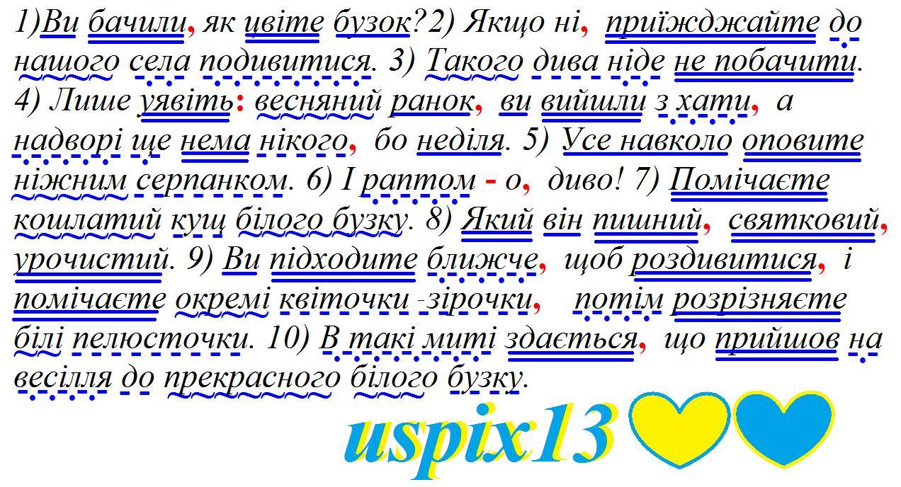 Виділити члени речення )Ви бачили як цвіте бузок?2) Якщо ні приїжджайте до нашого села подивитися. 3) Такого дива ніде не побачити. 4) Лише уявіть весняний ранок ви вийшли з хати а надворі ще нема нікого бо неділя. 5) Усе навколо оповите ніжним серпанком. 6) І раптом о диво! 7) Помічаєте кошлатий кущ білого бузку. 8) Який він пишний святковий урочистий. 9) Ви підходите ближче щоб роздивитися і помічаєте окремі квіточки – зірочки потім розрізняєте білі пелюсточки. 10) В такі миті здається що прийшов на весілля до прекрасного білого бузку.