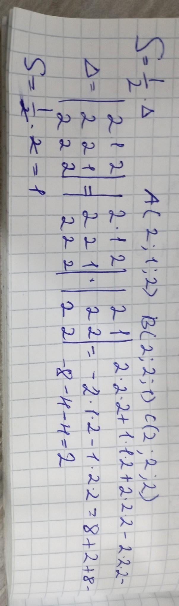 1. Знайти площу трикутника АВС, якщо А(2; 1; 2), В(2; 2; 1), С(2; 2; 2).