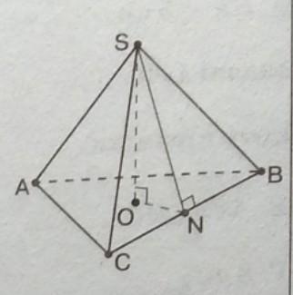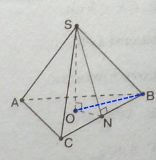Достроим отрезок OB, получим ΔOBN, в котором ∠ONB прямой, так как пирамида правильная, в основании нее лежит равносторонний треугольник, а вершина пирамида проецируется в центр вписанной окружности основания и ON является радиусом в точке касания прямой BC.