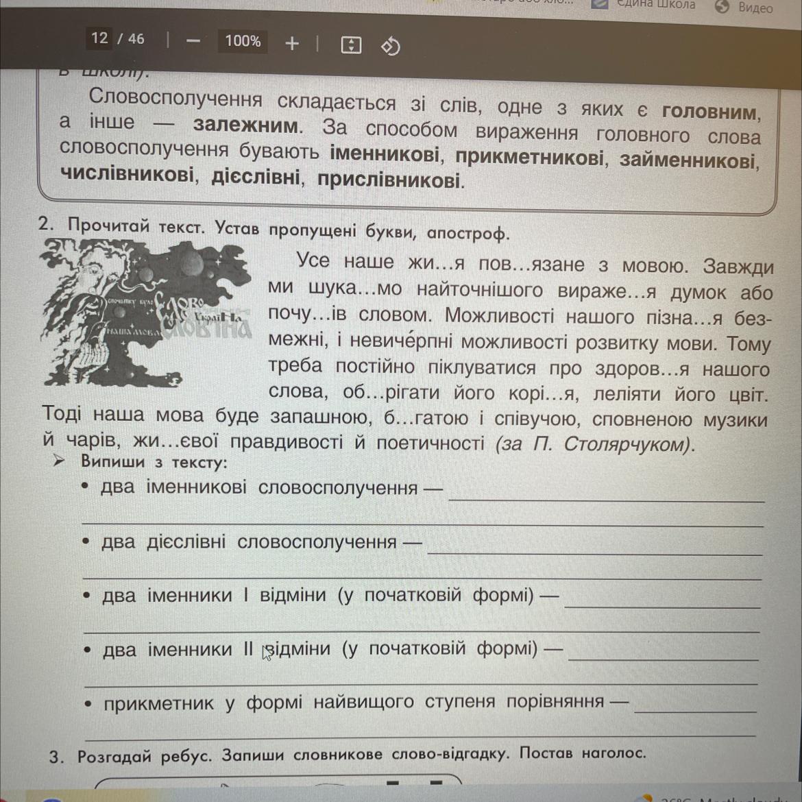 2. Прочитай текст. Устав пропущенi букви, апостроф.