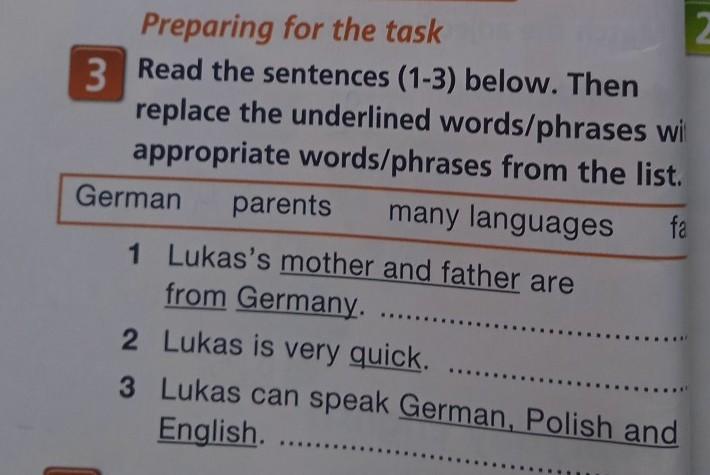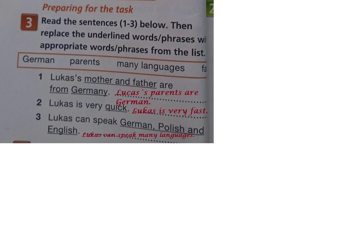 า 3 Read the sentences (1-3) below. Then replace the underlined words/phrases wi appropriate words/phrases from the list. German parents many languages fe 1 Lukas's mother and father are from Germany. 2 Lukas is very quick. 3 Lukas can speak German, Polish and English.