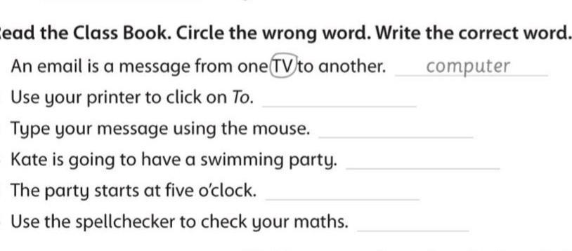 Read the Class Book. Circle the wrong word. Write the correct 1 An email is a message from one TV to another. computer 2 Use your printer to click on To. 3 Type your message using the mouse. 4 Kate is going to have a swimming party. 5 The party starts at five o'clock. 6 Use the spellchecker to check your maths. Пжж помагите