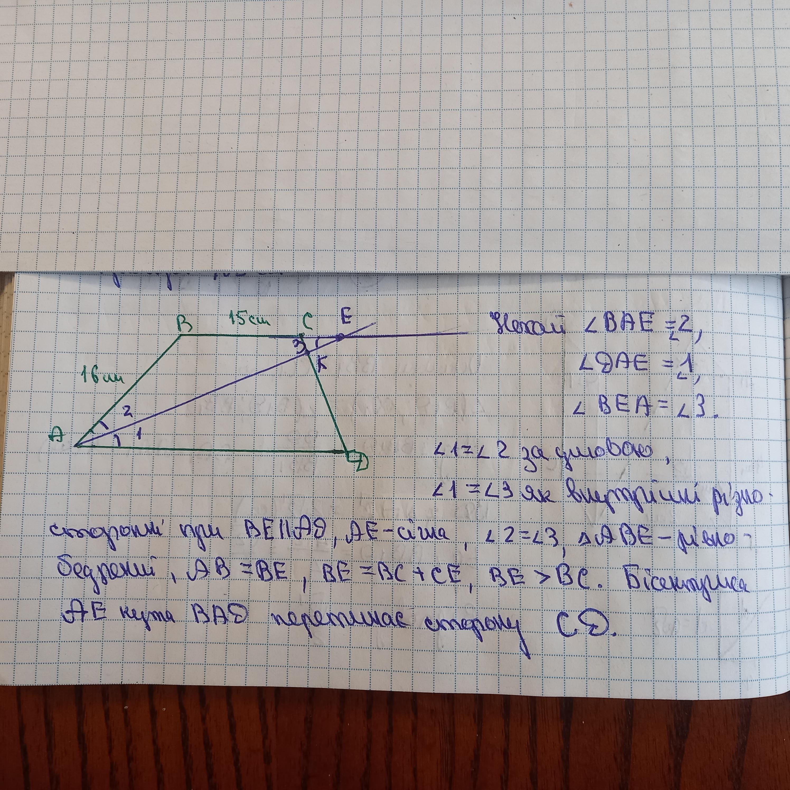 Бічна сторона АВ і менша основа ВС трапеції АВСD дорівнюють відповідно 16 і 15 см. Який з відрізків перетинає бісектриса кута BAD основу ВС чи бічну сторону СD?
