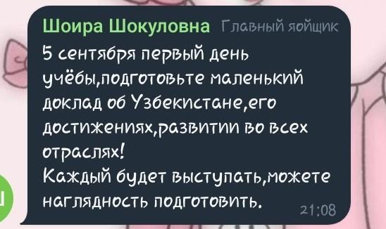 подготовьте маленький доклад об Узбекистане,его достижениях,развитии во всех отраслях! Kаждый будет выступать,можете наглядность подготовить. пожалуйста НЕ ПРО КАЗАХСТАН ИЛИ ДРУГИЕ СТРАНЫ А УЗБЕКИСТАН